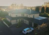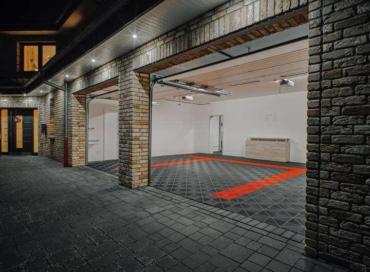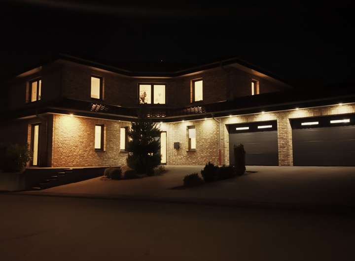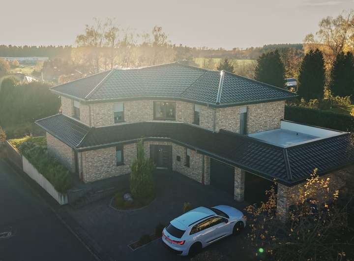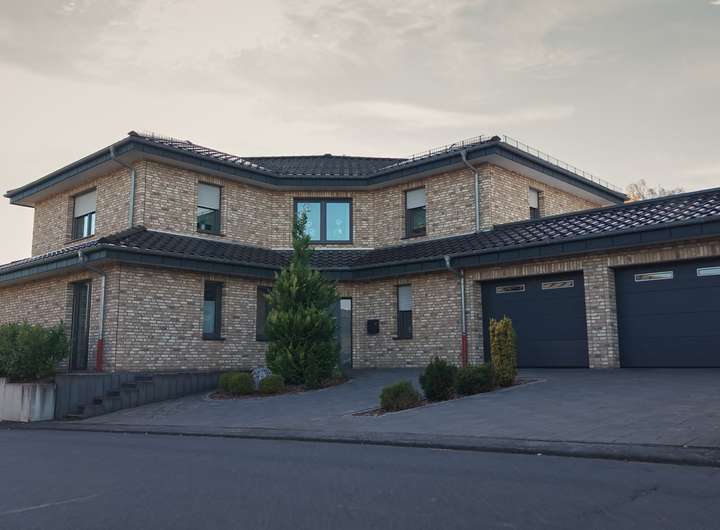 Außen überzeugt das Grundstück durch eine pflegeleichte Gestaltung, die nahezu ohne Rasenmähen auskommt. Alle Flächen sind mit Terrassenplatten versehen, sodass eine großzügige, stilvolle Outdoor-Umgebung entsteht. Die große Doppelgarage bietet Platz für zwei Autos und ermöglicht direkten Zugang zu den Technik- und Werkräumen.