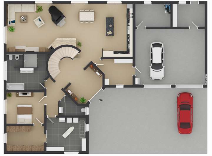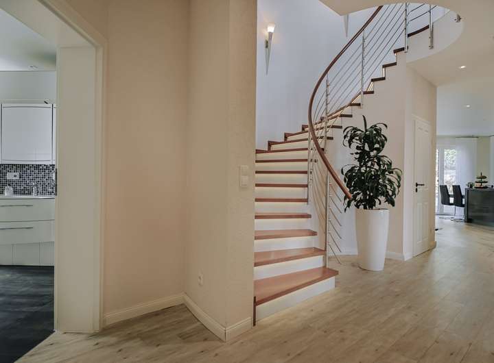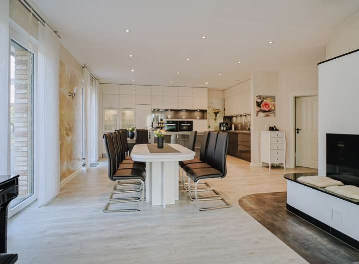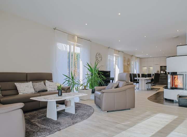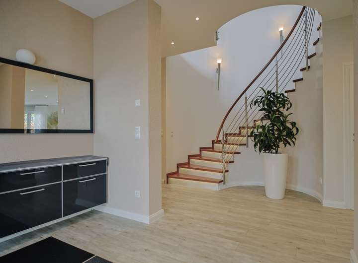 Dieses exklusive Einfamilienhaus aus dem Jahr 2016 vereint luxuriöses Wohnen mit durchdachter Funktionalität und beeindruckt durch großzügige Raumplanung sowie vielfältige Extras. Der Eingangsbereich im Erdgeschoss empfängt mit der imposanten, abgerundeten Treppe, die das Zentrum des Hauses markiert. Der Wohnbereich besticht durch Lichtdurchflutung und eine hochwertige, offene Küche mit Küchenblock und direktem Ausgang zu den Terrassenflächen. Das Schlafzimmer, mit Zugang zum Ankleidezimmer, bietet eine Ruhezone des Hauses mit praktischer Angrenzung zum Hauswirtschaftsraum. Zusätzlich verfügt das Erdgeschoss über ein praktisches Gäste-WC, einen Abstellraum für Lebensmittel mit direkter Durchgangsmöglichkeit zur großen Doppelgarage, sowie einen Zugang zum Außenbereich des Hauses. Der angrenzende Technikraum (Heizungsraum) beherbergt unter anderem auch eine Belüftungsanlage und ein Staubsaugersystem mit Filter.