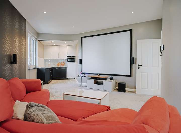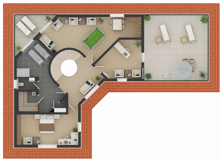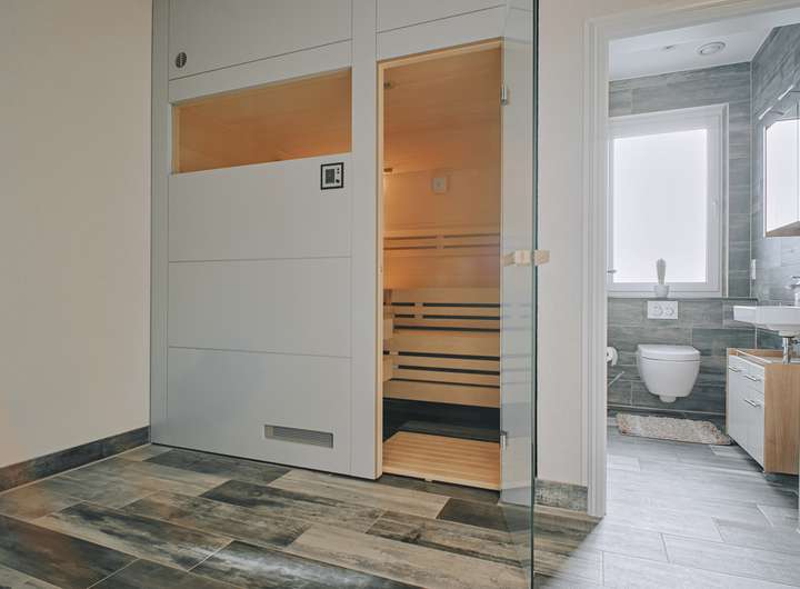 Im Obergeschoss erwartet Sie ein vielseitiges Raumprogramm: ein großer Kinoraum mit eigener Küchenecke bietet Platz für Entertainment und Familienabende, während der Wellnessbereich mit Dampfsauna und finnischer Sauna, sowie einer großzügigen offenen Dusche und einem separaten WC für Entspannung sorgen. Weiterhin befinden sich hier ein großes Kinderzimmer sowie ein Arbeitszimmer mit Zugang zur Dachterrasse.