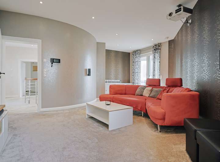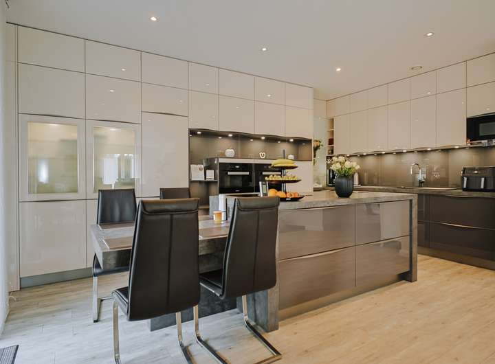 Die Küche ergänzt das hochwertige Interieur – sie ist eines der Highlights dieser Ausstattung. An den Wänden kommt teilweise eine hochwertige Spachteltechnik zum Einsatz, die den Räumen eine edle Note verleiht. LED-Spots in der Betondecke setzen modernes Lichtdesign-Elemente und tauchen das Interieur in angenehmes Licht. Die Dachterrasse wartet noch darauf, ausgestattet zu werden, sodass hier individuell eine stilvolle Outdoor-Wohnfläche geschaffen werden kann.