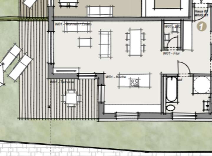 Die 3-Zimmer-Wohnung befindet sich im vorderen Haus im Erdgeschoss mit großer Terrasse, teilweise überdacht und Garten