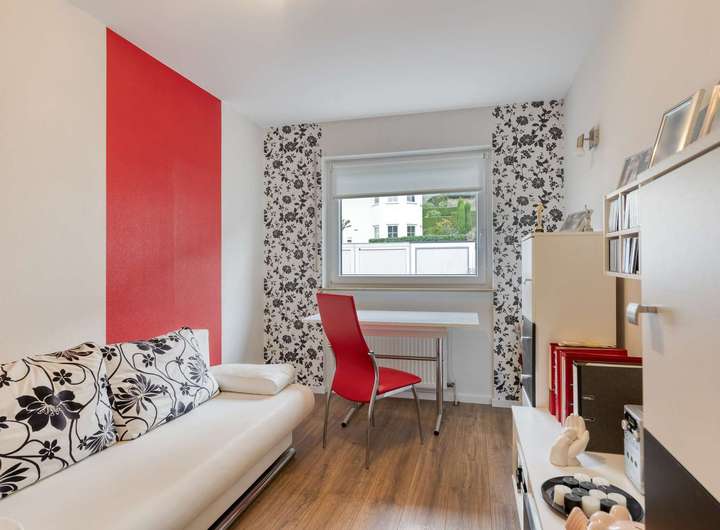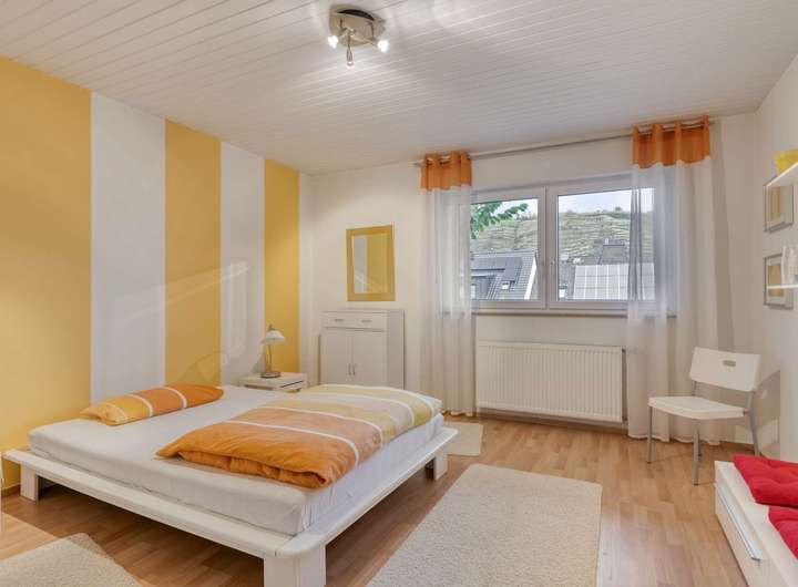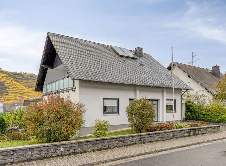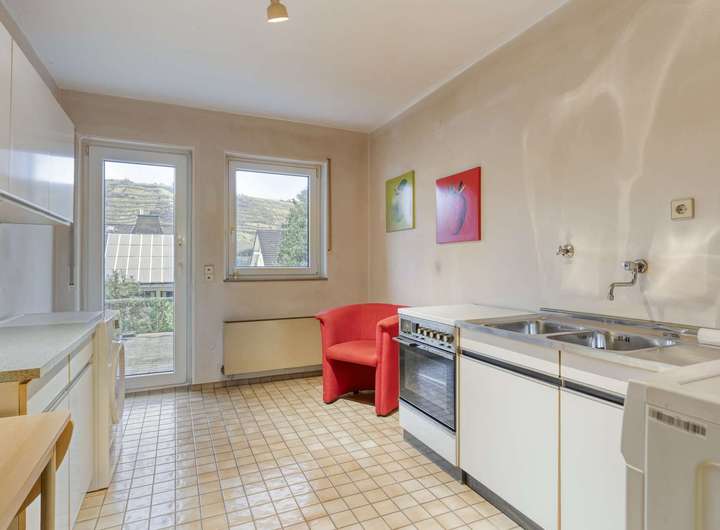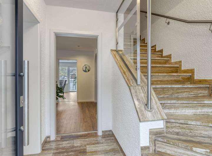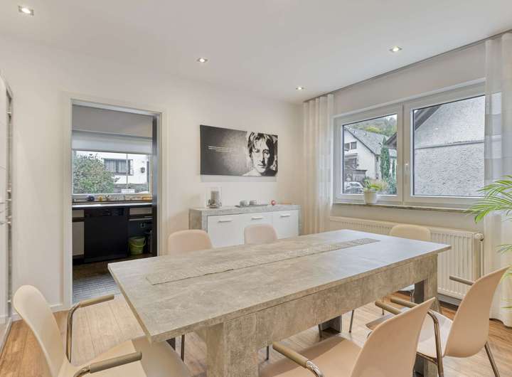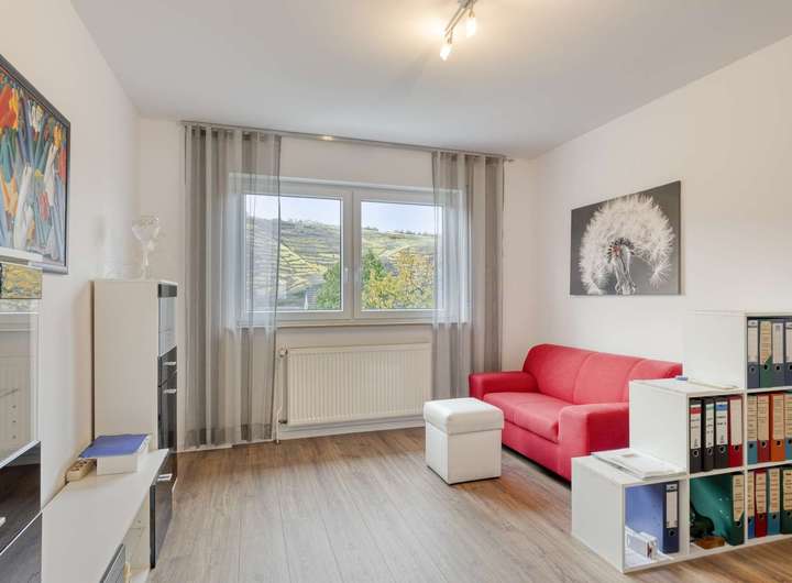 Im Erdgeschoss empfängt Sie ein Windfang mit angrenzendem Gäste-WC und eine helle Diele, die den Zugang zum Wohnbereich eröffnet. Das lichtdurchflutete Wohnzimmer bietet direkten Zugang zum Balkon mit einem schönen Blick auf die Weinberge von Winningen. Die an den Essbereich angrenzende Küche ist funktional gestaltet und fügt sich harmonisch in das Raumkonzept ein. Ergänzt wird diese Etage durch ein Gästezimmer, ein Büro und eine Abstellkammer.