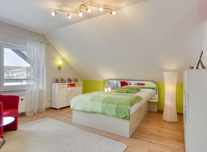 Im Obergeschoss befinden sich drei großzügige, helle Schlafzimmer, von denen eines Zugang zur überdachten Loggia bietet. Das geräumige Tageslichtbad befindet sich im Originalzustand und bietet Raum für individuelle Modernisierungen. Über eine Treppe im Flur gelangt man in den ausgebauten Spitzboden, der in den 1990er-Jahren gedämmt und zu einem wohnlich nutzbaren Bereich umgestaltet wurde – ideal als zusätzliches Schlaf-, Arbeits- oder Spielzimmer. Von hier aus eröffnet sich ein schöner Blick auf die Mosel.