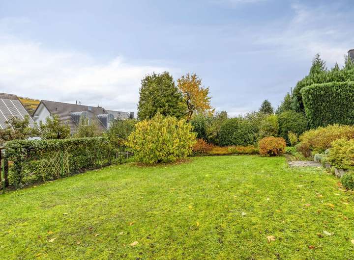 Der Außenbereich besticht durch eine gepflegte Gestaltung mit teils überdachter Terrasse und einem ansprechend angelegten Garten, der Raum für Erholung und Freizeit bietet. Eine Garage mit elektrischem Sektionaltor schließt direkt an das Haus an. Zusätzliche Stellplätze stehen vor der Garage und in der verkehrsberuhigten Sackgasse zur Verfügung.
