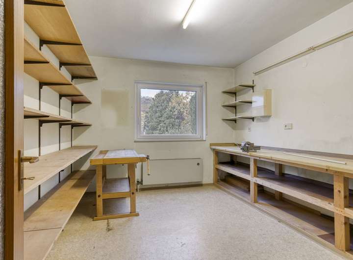 Das Untergeschoss bietet weitere Nutzungsmöglichkeiten und überzeugt durch seine praktische Aufteilung. Neben einem Hobbyraum befinden sich hier ein Gästezimmer mit angrenzendem Duschbad, eine Sommerküche/ Hauswirtschaftsraum mit direktem Zugang in den Garten sowie mehrere Nutz- und Technikräume für Lager, Werkstatt und Heizung.
