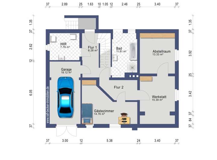 - Garage im Kellerbereich mit ca. 18 Quadratmeter Fläche