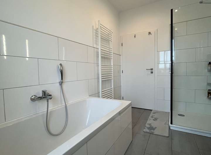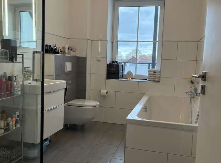 Das große Wohlfühlbadezimmer mit Fenster ist hell gestaltet und verfügt über zeitgemäße Sanitärausstattungen inklusive bodentiefer Dusche und einer zusätzlichen Einbauwanne.