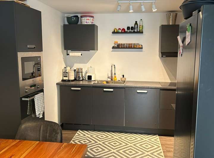 Teilweise Parkett und Vinylboden. Einbauküche (ohne Kühlschrank) 1 Balkon Richtung Süden, 1 Balkon Richtung Westen, Bad mit Anschluss für Waschmaschine und Dusche (keine Badewanne)
