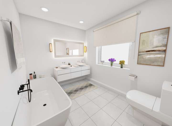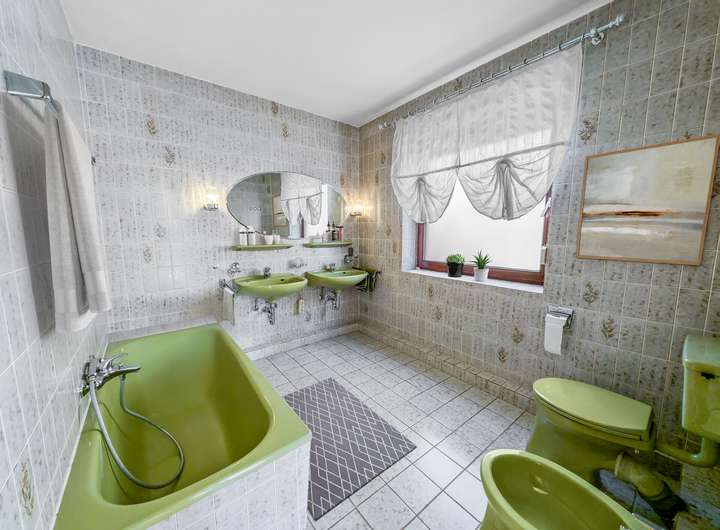- Hauptbad en Suite im 70er-Stil: Doppelwaschbecken, Badewanne, Bidet