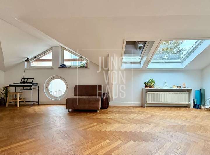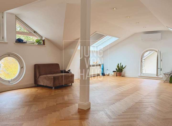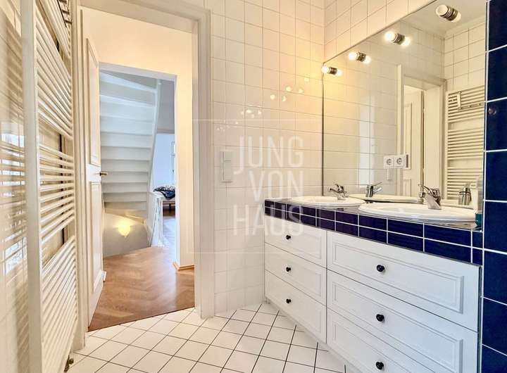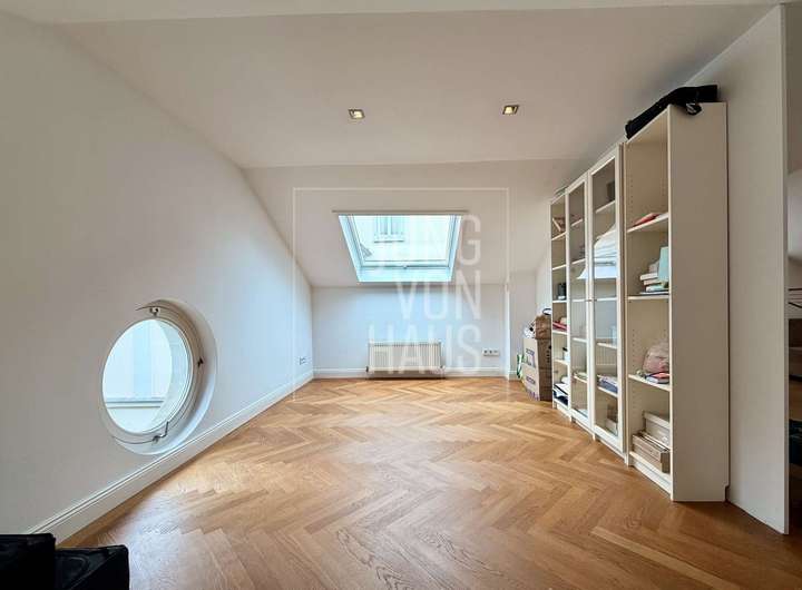 The upper floors feature a master bedroom with an en-suite bathroom including a bathtub, as well as an additional air-conditioned bedroom with an adjoining daylight bathroom. The top floor is designed as a spacious studio of approximately 45 square meters, also air-conditioned, and ideal for use as a home office, guest room, or creative space.