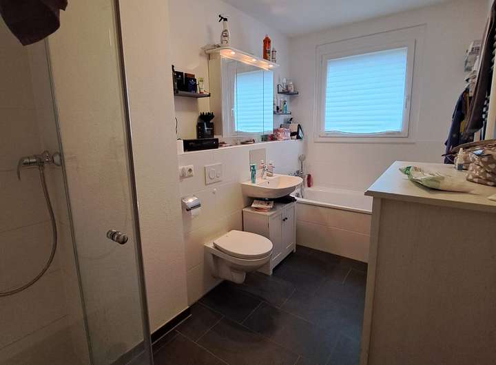 Großes Vollbad mit ebenerdiger Dusche, Badewanne & Handtuchheizung