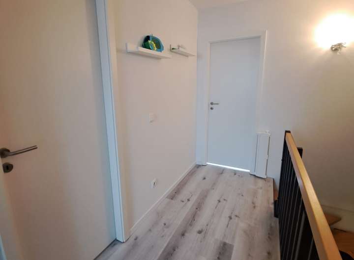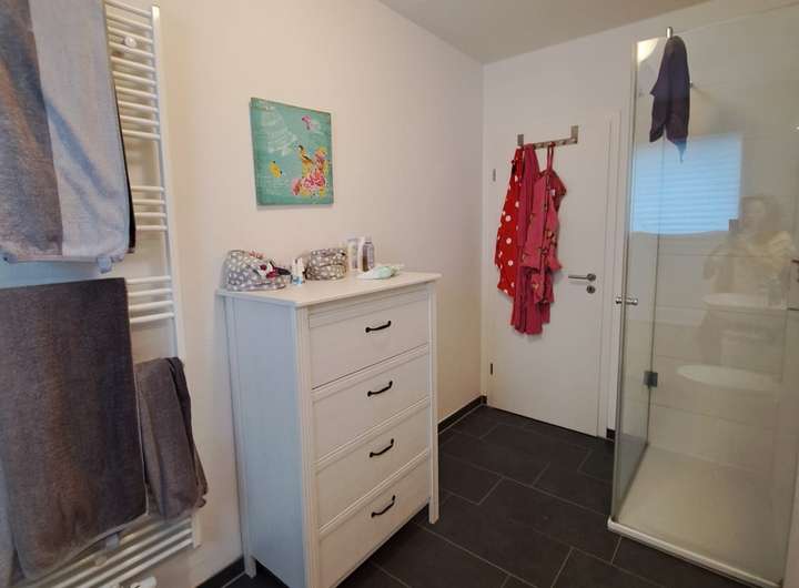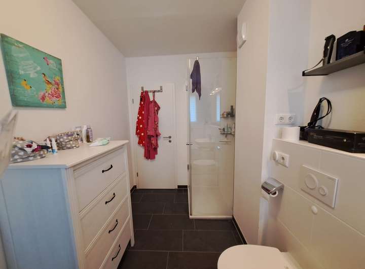 Im 1. Obergeschoss stehen zwei Schlafzimmer zur Verfügung, ergänzt durch ein großes Vollbad mit Dusche, Badewanne und Handtuchheizkörper. Ein innenliegender Ankleideraum bietet praktischen zusätzlichen Stauraum.