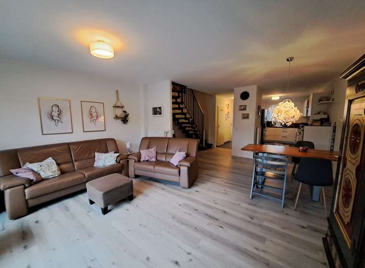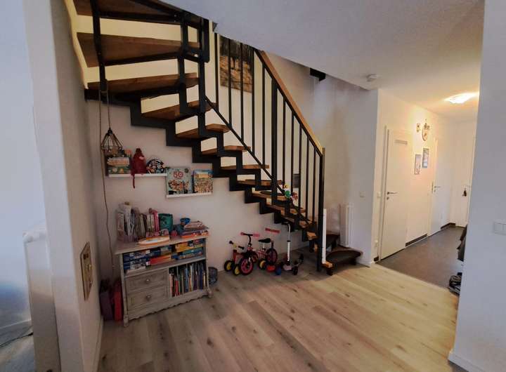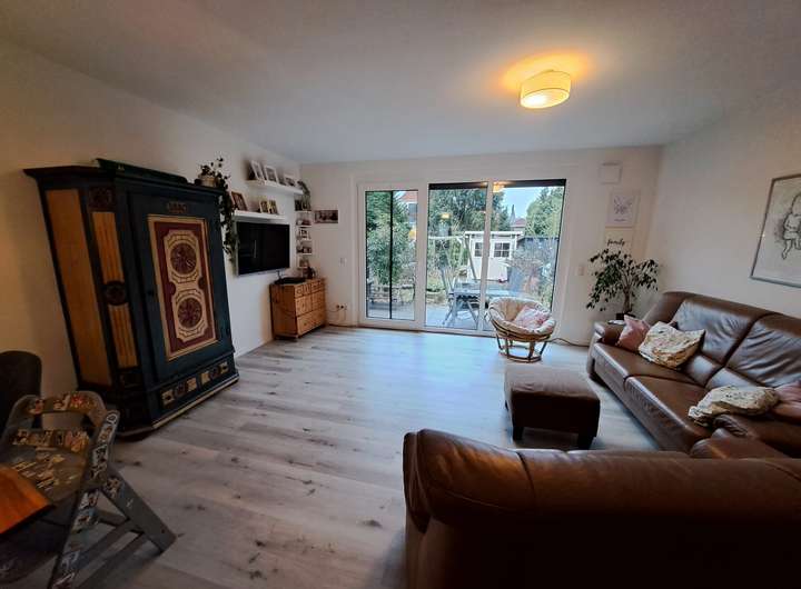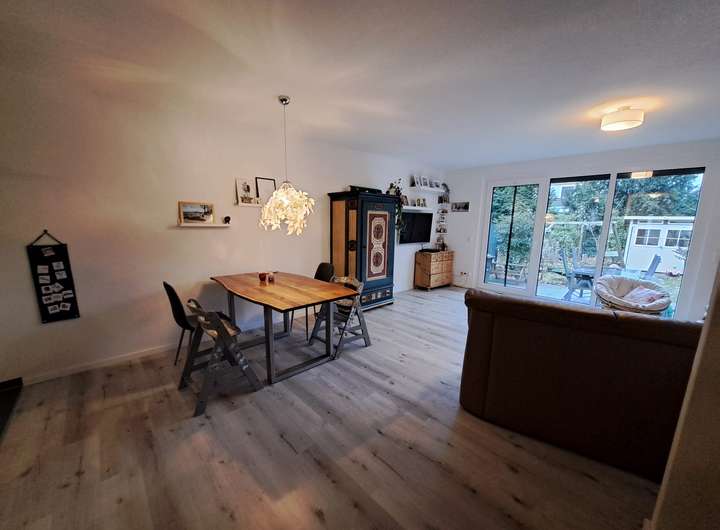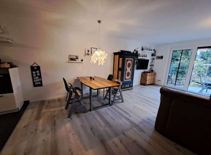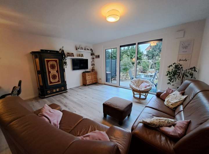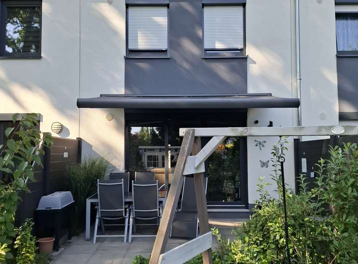 Das Erdgeschoss umfasst einen offenen Wohn- und Essbereich mit direktem Zugang zur Terrasse, eine moderne Einbauküche mit hochwertigen Elektrogeräten, ein Gäste-WC sowie einen Hauswirtschafts-/Heizungsraum. Die großzügige Terrasse mit elektrischer Markise und der pflegeleichte Garten erweitern den Wohnbereich ideal nach außen.