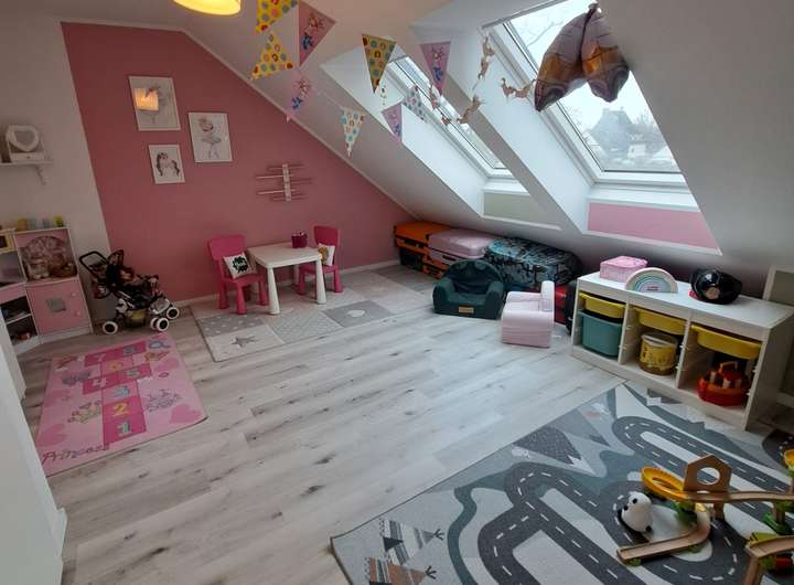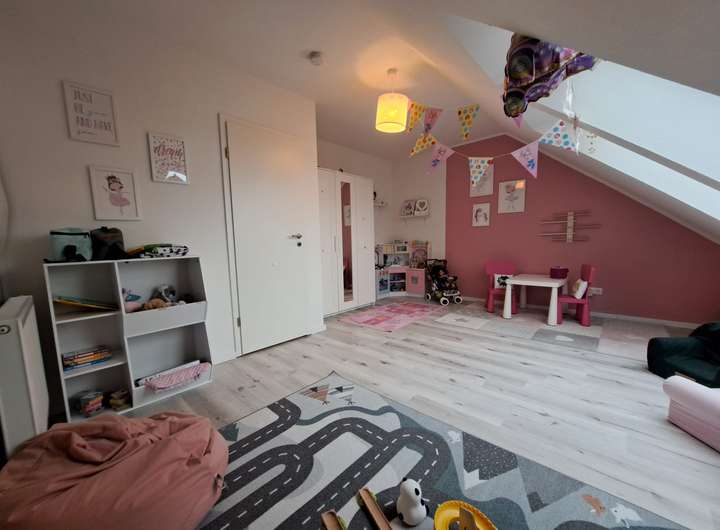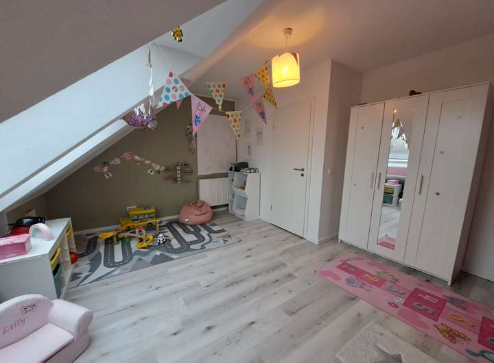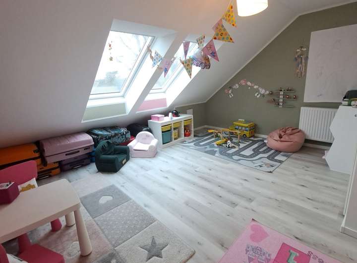 Das Dachgeschoss verfügt über zwei weitere helle Schlafzimmer sowie einen separaten Wäscheraum mit Fenster, Heizung und Waschmaschinenanschluss. Über den Flur besteht Zugang zum begehbaren Dachboden, der weitere Nutzfläche bietet.
