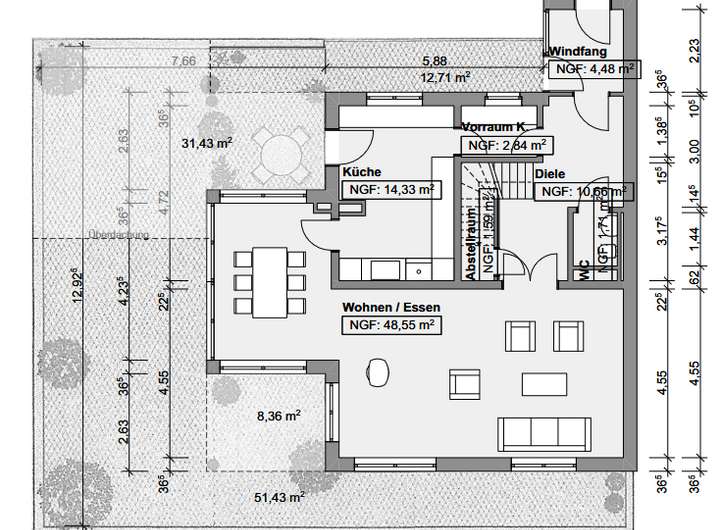Die 15,14 m² große Diele heißt Sie willkommen. Hier gibt es Platz für die Garderobe. Von hier aus haben Sie Zugang zum Balkon, zum Gäste-WC und zum Vorraum der Küche. Des Weiteren befindet sich hier die Treppe, die Sie zu den Räumen im Dachgeschoss führt. Über eine Doppelflügeltür betreten Sie den fast 50 m² großen Wohn-Essbereich mit enormen Fensterfronten. Von hier aus haben Sie Zugang zur teilweise überdachten Terrasse, die unglaubliche 103 m² misst.