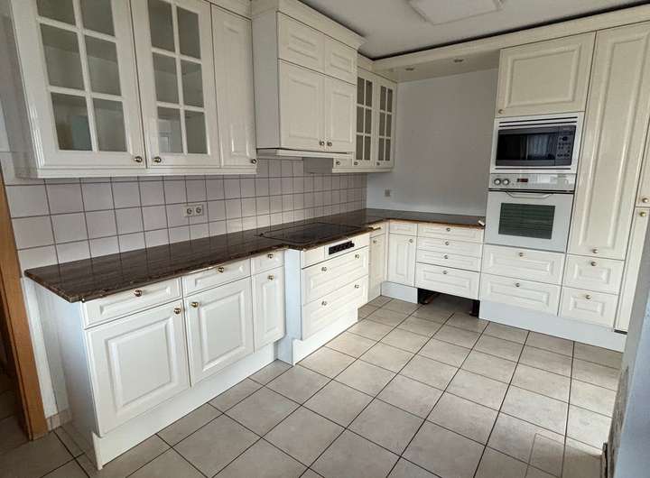 Das ausgedehnte Esszimmer schließt sich an. Auch dieser Raum verfügt über eine beachtliche Fensterfront. Über eine Schiebetür betreten Sie die 14,33 m³ große Küche, die viel Stauraum und große Arbeitsflächen bietet. Der direkte Zugang zur Terrasse, sowie zum Vorraum erspart Ihnen große Wege.