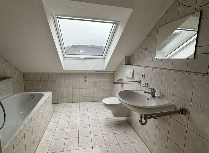 Das Bad ist ausgestattet mit: Waschbecken, WC, Badewanne und Dusche und ist raumhoch gefliest.