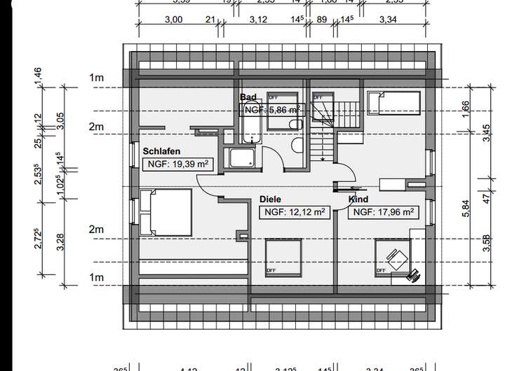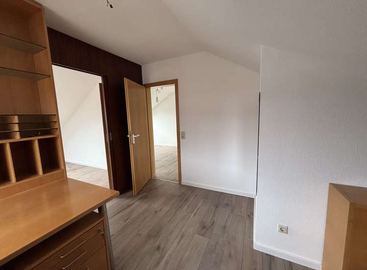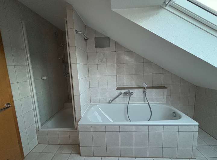 In der darüberliegenden Etage (Dachgeschoss) befinden sich weitere vier Räume und ein Badezimmer mit Dusche und Badewanne.