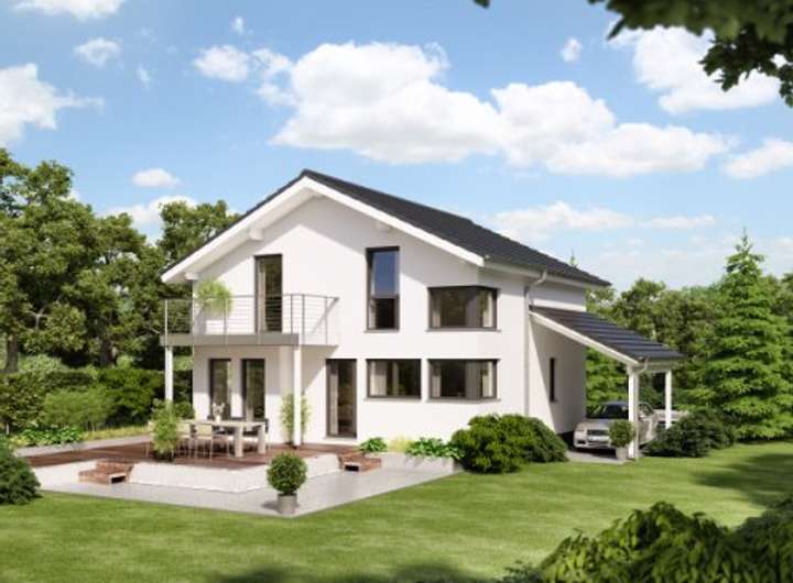 Eine charmante Außengestaltung und viel Platz im Innern: Dieses Fertighaus ist ein wahrer Wohntraum für eine vierköpfige Familie. Mit dem klassischen Satteldach - in diesem Planungsbeispiel dunkel eingedeckt - und der klaren Linienführung fügt es sich harmonisch in jedes Baugebiet ein, egal ob es sich auf dem Land oder im urbanen Umfeld befindet. Akzentuiert wird der weiß verputzte Hauptbaukörper von einem Querhaus mit Satteldach und einem Rechteckbalkon, der von filigranen Stützen getragen wird. Beide Architektur-Bauteile hüllen sich in einen sehr natürlich wirkenden Braunton. Der Balkon wird eingerahmt von einer transparenten Glasbrüstung. Sie betont nicht nur den modernen Charakter des Hauses, sondern erweist sich zudem noch als sehr langlebig und pflegeleicht. Abgerundet wird das elegante Design von bodentiefen Fensterelementen auf beiden Ebenen, die die Innenräume mit Tageslicht durchfluten. Dank der offenen Raumaufteilung im Erdgeschoss kann sich die Sonne in jeden Winkel ausbreiten. Bereits in der Diele bemerkt man das luftig-leichte Ambiente, das den Innenbereich prägt. Rechts neben dem Eingang liegt ein geräumiger Technikraum inklusive Abstellfläche für all die Dinge, die man nicht täglich benötigt. Links befindet sich ein flexibel nutzbares Zimmer. Auf den knapp 10 m² könnte ein ruhiges Büro, ein Gästezimmer oder ein zusätzliches Kinderzimmer entstehen. Später lässt sich hier auch das Schlafzimmer platzieren. Dank des Duschbads ist so ein barrierefreies Leben auf einer Ebene möglich. Über einen breiten Durchgang schließt sich der weitläufige Wohn-, Ess- und Kochbereich an, der ganz den gemeinschaftlichen Aktivitäten der Familie gewidmet ist. Privatsphäre finden die Bewohner im Dachgeschoss, das die Individualräume beherbergt. Die Dachschrägen verleihen den Räumen Gemütlichkeit. Die großzügige Wohnfläche von knapp 69 m² sorgt dabei für Bewegungsfreiraum und bietet ausreichend Stellmöglichkeiten für die Möbel. Zwei Kinderzimmer, ein Elternschlafraum mit offen angeschlossenem Ankleidebereich und ein großes Familienbad bieten alles, was eine vierköpfige Familie zum Leben und Wohlfühlen braucht.