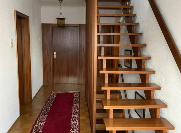 Großzügige Flur- und Dielenbereiche, die durch massive Holztreppen miteinander verbunden sind, verstärken den Eindruck eines offenen modernen Wohnkonzeptes.