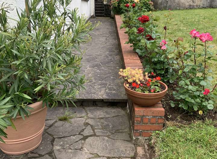 Die Zufahrt und die Zugänge zum Haus sind mit Porpphyrplatten gepflastert; der rückwärtige Gartenteil des Grundstücks ist als Rasenfläche mit Beeten von Rosen, Lavendel und Hortensien angelegt.