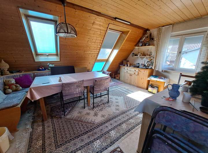 Das DG wurde 1995 ausgebaut mit 2 Zimmer, eines davon mit Waschbecken, sodass es sich auch gut als Gästezimmer anbietet. Ebenso kann es als 2. Schlafzimmer genutzt werden, entsprechende Steckdosen für die Nachtkästchen sind vorhanden. Ganz oben befindet sich eine isolierte Bühne, die viel Stauraum bietet und durch eine Auszugsleiter (Luke) betreten werden kann.