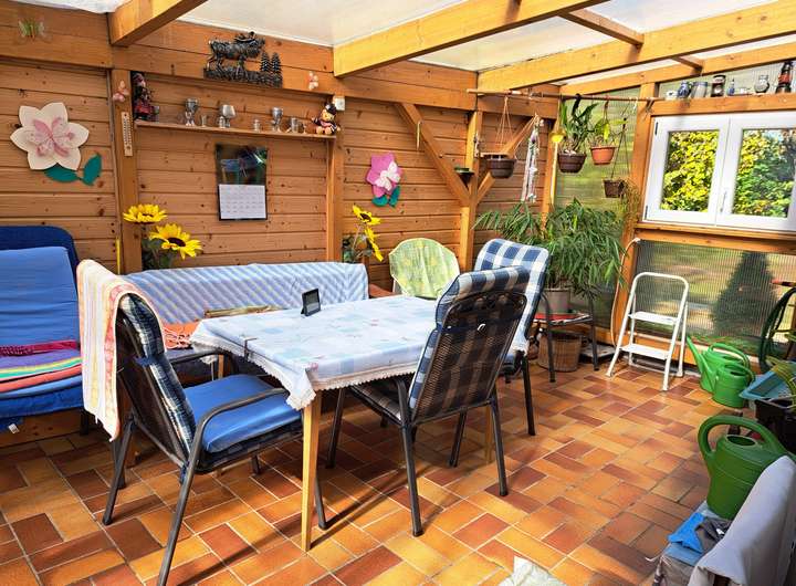 Vom Wohnzimmer aus gelangen Sie in den geräumigen Wintergarten, der mit einer elektrischen vollautomatischen Sonnenschutz-Markise versehen ist.