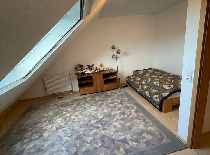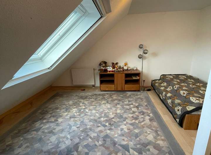 Im Dachgeschoss bieten 2 weitere große Schlafzimmer Platz , zum Beispiel als Kinderzimmer . In einem der Zimmer sind schon Vorbereitungen für sanitäre Anlagen getroffen. Außerdem gelangen Sie vom Dachgeschoss zur Dachbühne die zusätzlichen Stauraum bietet.