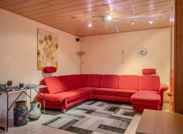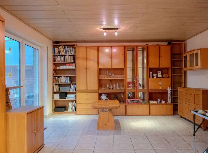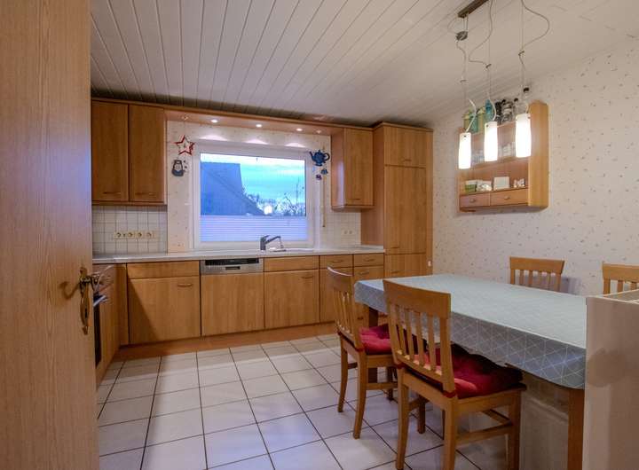 Im Erdgeschoss befinden sich eine großzügige Küche mit Einbauküche und Essbereich, ein großes Wohn- und Esszimmer mit Zugang zur überdachten Terrasse, ein Hauswirtschaftsraum mit Einbauschränken sowie zwei weitere, kleine Abstellräume, welche viel zusätzlichen Stauraum bieten. Das zusätzliche Gäste-WC ist praktisch für Besuch. Die massive Treppe führt in das Dachgeschoss. Dort befinden sich drei Schlafzimmer, ein Badezimmer mit Dusche und Badewanne und ein weiteres Zimmer, welches als Hobbyraum genutzt wurde.