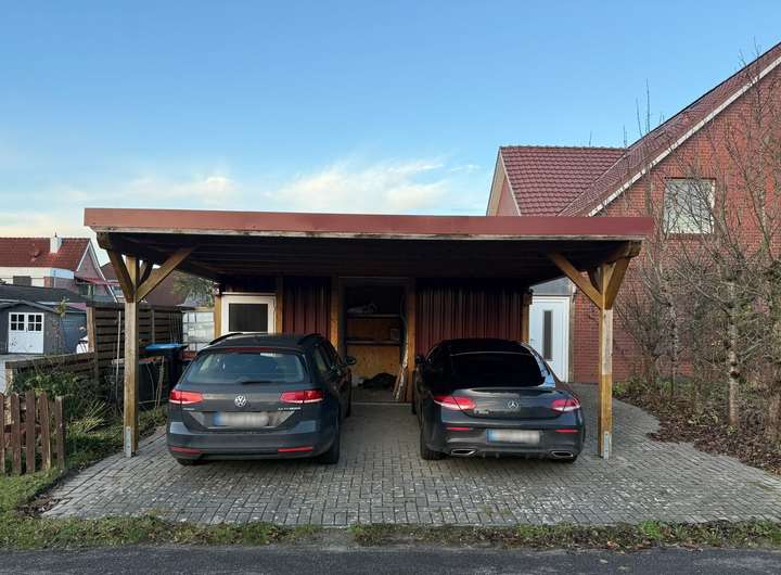 Die große, überdachte Terrasse grenzt an den Garten. Die Überdachung wurde in 2016 durch eine Fachfirma gebaut. Durch eine seitliche Tür gelangt man zum Doppelcarport aus dem Jahr 2016, welches nicht nur ausreichend Platz für zwei PKW bietet, sondern auch über zwei Abstellräume für Gartengeräte oder Hobbyzubehör verfügt.