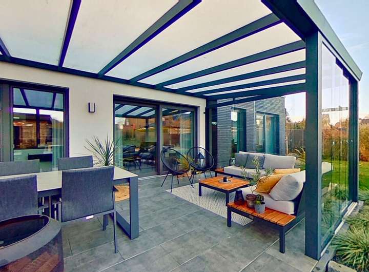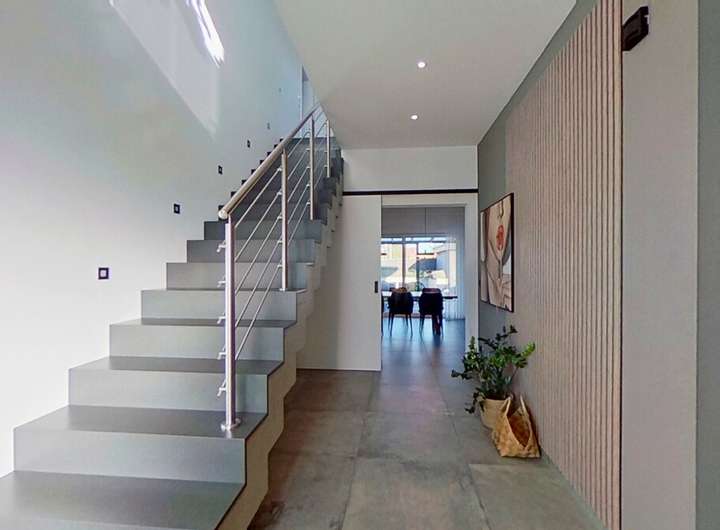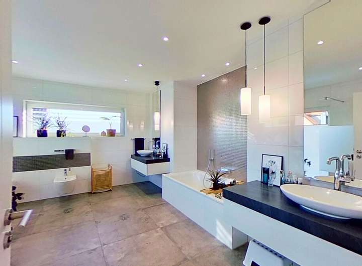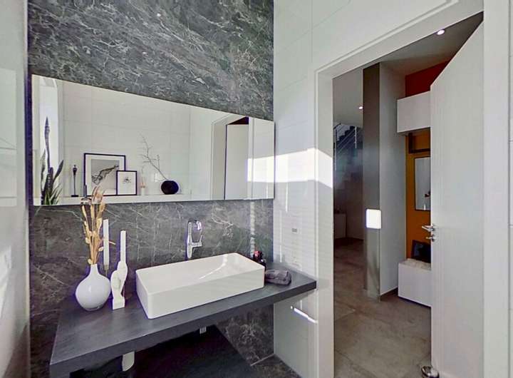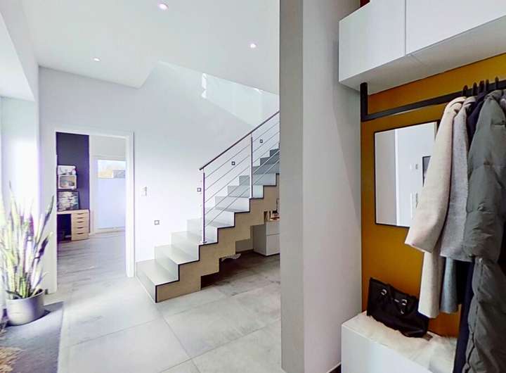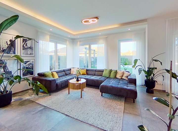 Diese moderne Immobilie überzeugt mit einem durchdachten Grundriss, großzügigen, lichtdurchfluteten Räumen und einem eleganten Wohnstil, der Komfort und Design auf harmonische Weise verbindet. Bereits beim Betreten spürt man die offene Atmosphäre, die durch die klaren Linien, die wertigen Materialien und die architektonische Großzügigkeit entsteht.