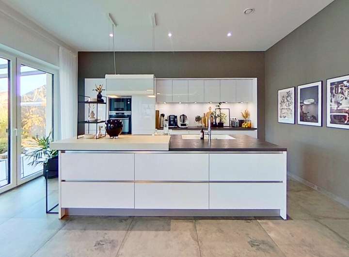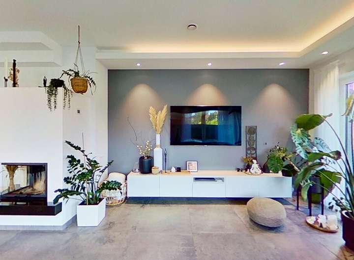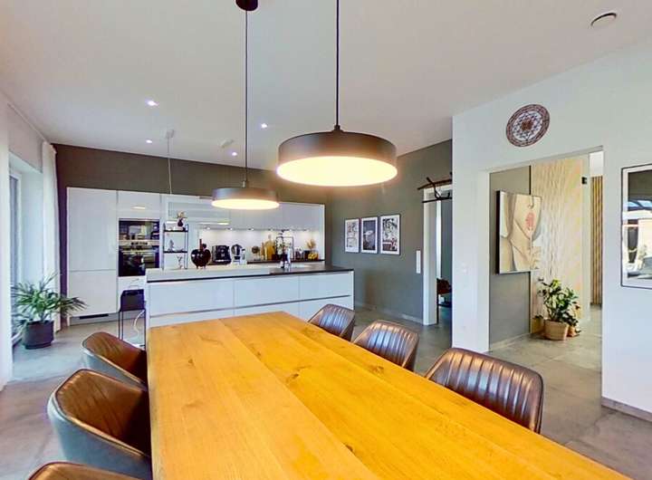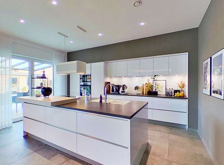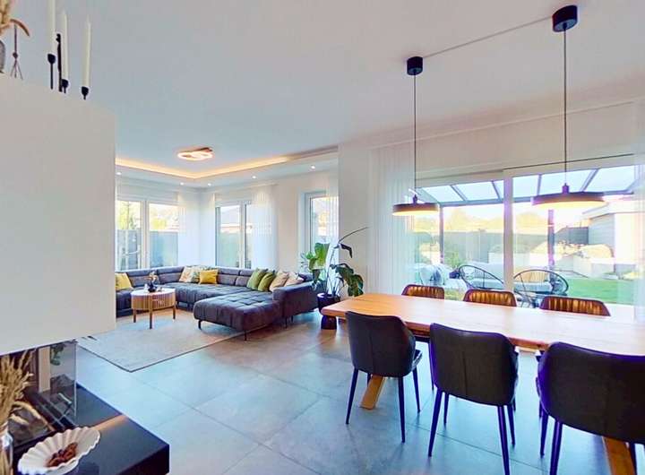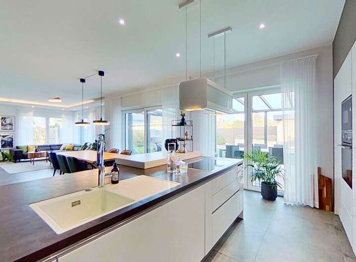 Das Herzstück des Hauses bildet der weitläufige Wohnbereich, der dank großer Fensterflächen einen beeindruckenden Lichteinfall bietet. Der stilvolle Kamin schafft dabei eine warme, behagliche Stimmung und macht den Raum zu einem idealen Treffpunkt für Familie und Freunde. Die hochwertige, modern gestaltete Küche fügt sich perfekt in das Wohnkonzept ein und bietet alles, was anspruchsvolle Hobbyköche sich wünschen.