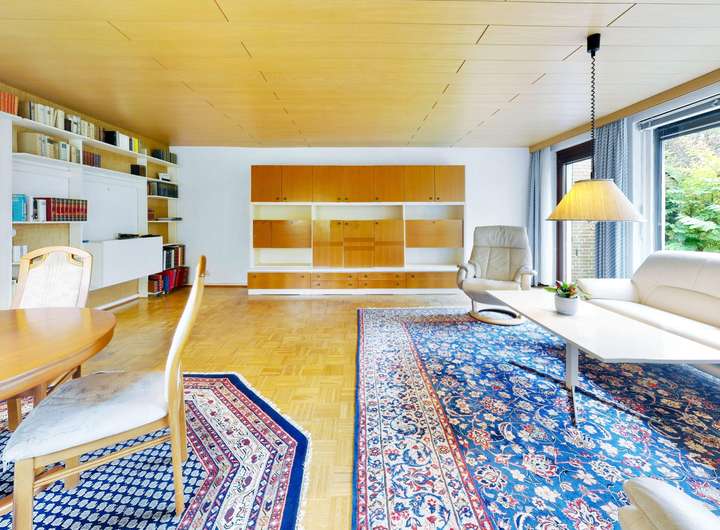 Im Erdgeschoss befindet sich der großzügige Wohn- und Essbereich mit schönem Parkettboden und direktem Zugang zur Terrasse und in den Garten. Große Fensterflächen sorgen für eine helle, freundliche Atmosphäre und schaffen ein angenehmes Wohngefühl.