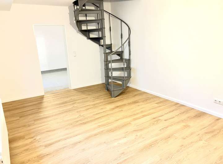 Beim Betreten der Wohnung gelangt man direkt in die Küche. Von dort aus führt eine Tür in das Wohnzimmer, in dem sich auch die Wendeltreppe ins Obergeschoss befindet.
