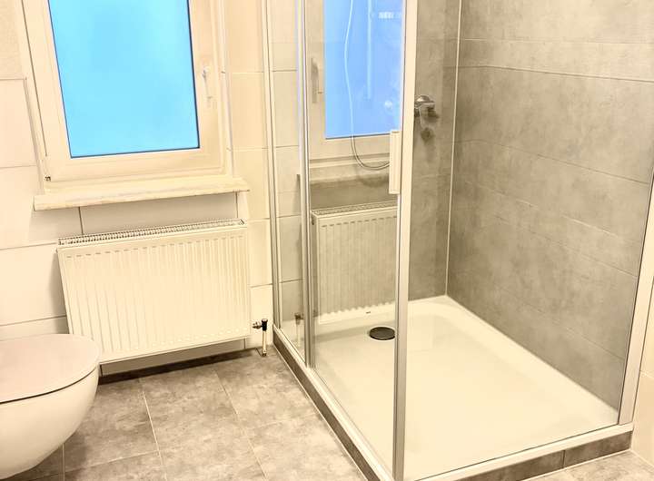 - Badezimmer mit WC, Fenster und Dusche mit Duschkabine