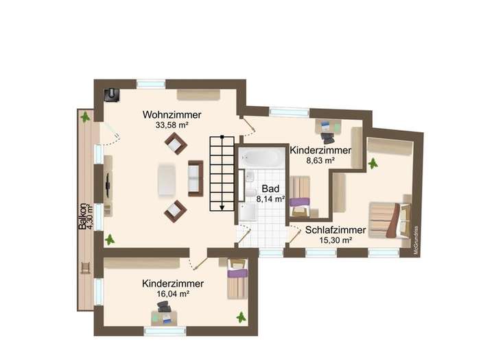 • Obergeschoss: Schlafzimmer mit Balkonzugang, zwei Kinderzimmer,