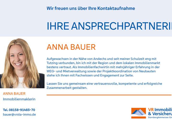 Haben wir Ihr Interesse geweckt? Gerne stehen wir Ihnen für ein informatives Erstgespräch sowie einen Besichtigungstermin vor Ort zur Verfügung. Ihre Ansprechpartnerin, Frau Anna Bauer, erreichen Sie telefonisch unter 08158 91483-70. Wir freuen uns auf Ihre Anfrage.