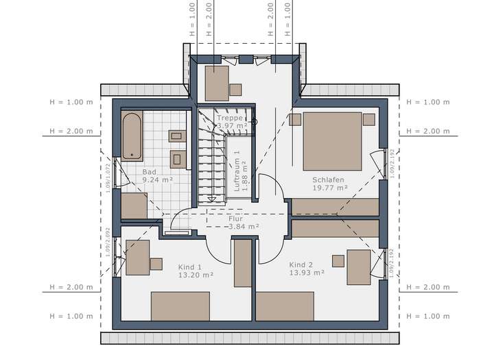 Das großzügige Einfamilienhaus besticht durch die modernen, großflächigen Fenster, die viel Licht ins Innere lassen und zum Verweilen mit Familie und Freunden einladen. Wohnen, Essen und Kochen bilden im Erdgeschoss eine Einheit und bieten über die Terrasse direkten Zugang in den Garten, sodass Sie Ihre Kinder stets im Blick haben. Im Erdgeschoss befinden sich außerdem ein Technikraum sowie ein Gäste-WC. Im Dachgeschoss gibt es keinen Streit um die Auswahl der Zimmer, denn diese sind nahezu gleich groß und im großzügigen Wellness-Bad gibt es am Morgen auch kein Gedränge.