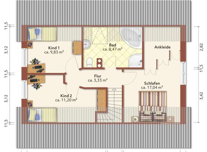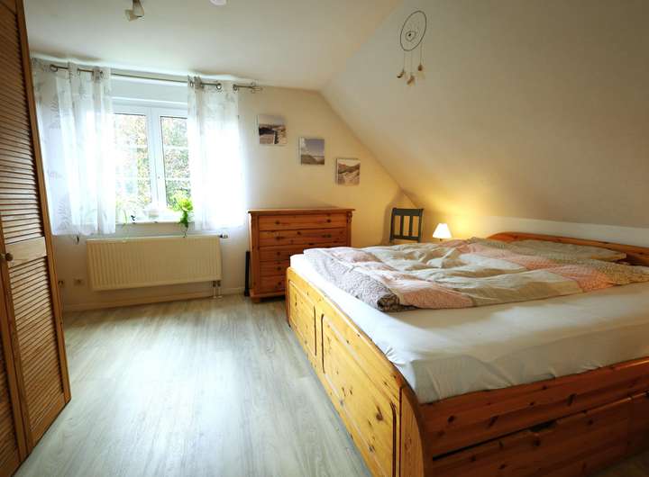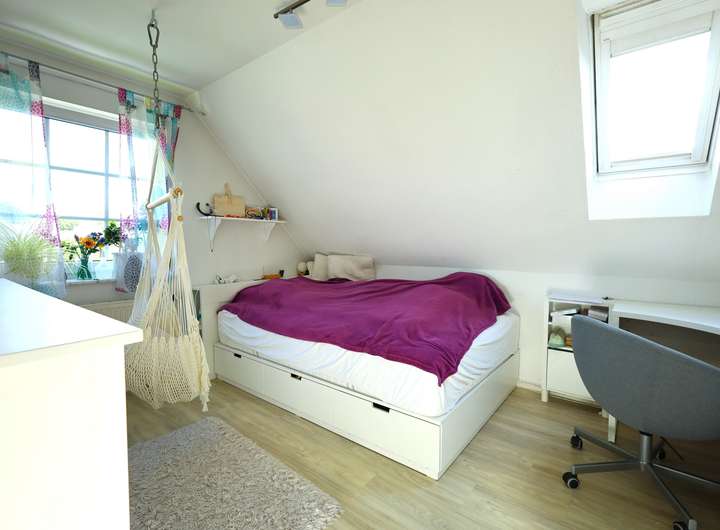Im Obergeschoss befinden sich drei helle Schlafzimmer mit pflegeleichtem Vinylboden. Das Elternschlafzimmer verfügt über einen begehbaren Kleiderschrank. Das großzügige Badezimmer bietet Entspannung: Lichterfüllt, ausgestattet mit einer großen Eckbadewanne mit Whirlpoolfunktion, einer Dusche mit Regenbrause und stilvollen Armaturen.