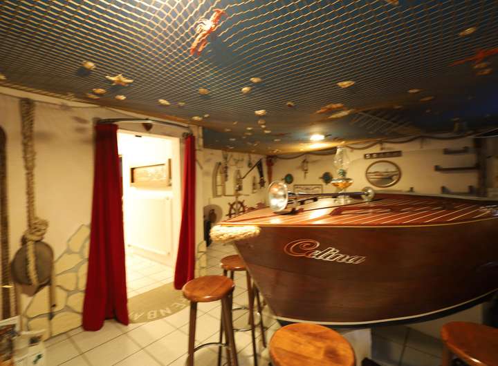 Neben großzügigen Abstellflächen und dem Heizungsraum begeistert der Keller mit einem besonderen Highlight: Ein liebevoll gestalteter Hobbyraum mit integrierter Bar im maritimen Stil. Der Blickfang ist ein ausrangiertes Holzboot, das kunstvoll zum Tresen umgebaut wurde – ein einzigartiger Ort für gesellige Abende, entspannte Stunden oder kreative Rückzugszeiten.