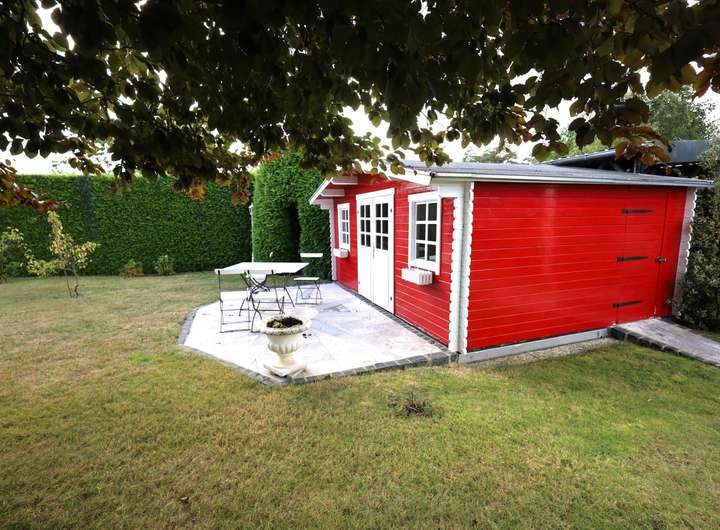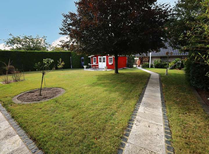 Der außenliegende Garten ist mit viel Liebe zum Detail angelegt: blickdichte Hecken, liebevolle Bepflanzung, eine überdachte Terrasse, eine zusätzliche Sonnenterrasse mit Blick auf das Haus sowie ein dekoratives Gartenhaus mit Stauraum runden das Angebot ab.