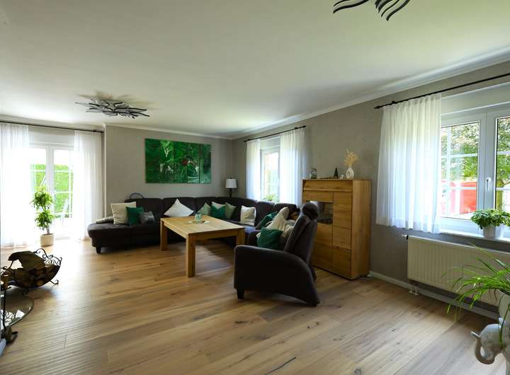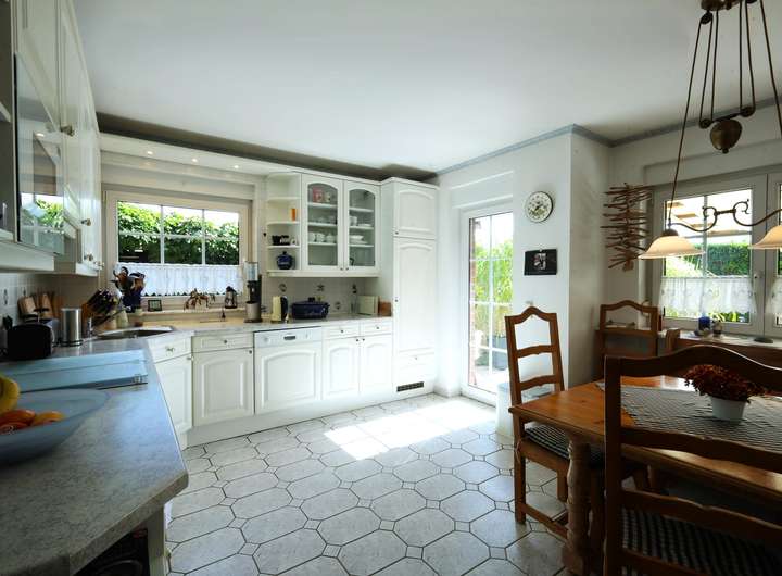 Das großzügige Wohnzimmer bietet direkten Zugang zur Terrasse und lädt zu gemütlichen Stunden ein. Die angrenzende Wohnküche im Landhausstil ist mit einer hochwertigen Einbauküche ausgestattet, bietet viel Bewegungsfreiheit, Platz für eine Sitzgruppe und ebenfalls einen Ausgang zur Terrasse – ideal für geselliges Kochen und Essen im Familienkreis.