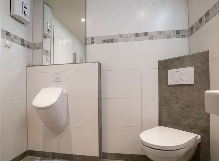 Jede Wohnung ist zusätzlich mit einer Fußbodenheizung ausgestattet (außer im Abstellraum), die für behagliche Wärme sorgt und das Raumklima optimiert.: Die Bäder sind mit hochwertigen, großzügigen ebenerdigen Duschen und einem Urinal ausgestattet. Viele Bäder verfügen über Oberlichter und/oder Dachfenster, die für zusätzliches Tageslicht sorgen und den Raum hell und einladend wirken lassen. Fliesen in einer modernen, aber zeitlosen Optik verlegt mit dekorative Ornamentfliesen setzen stilvolle Akzente und verleihen den Bädern einen besonderen Charakter.
