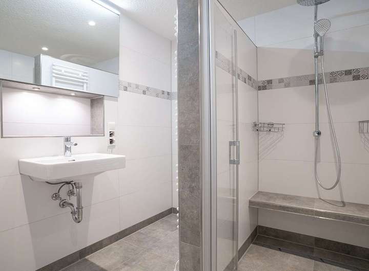 - hochwertig ausgestattete Bäder mit großen, ebenerdigen Duschen und Urinal, überwiegend mit Oberlicht und/oder Dachfenstern