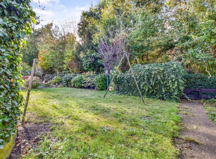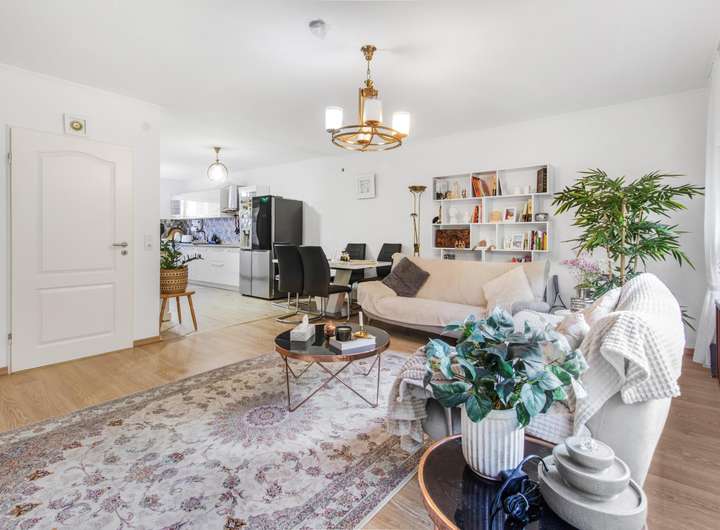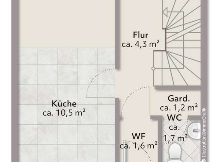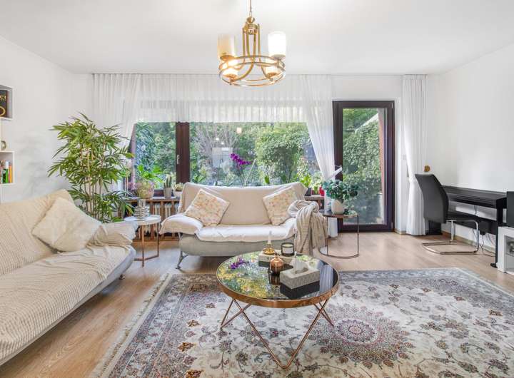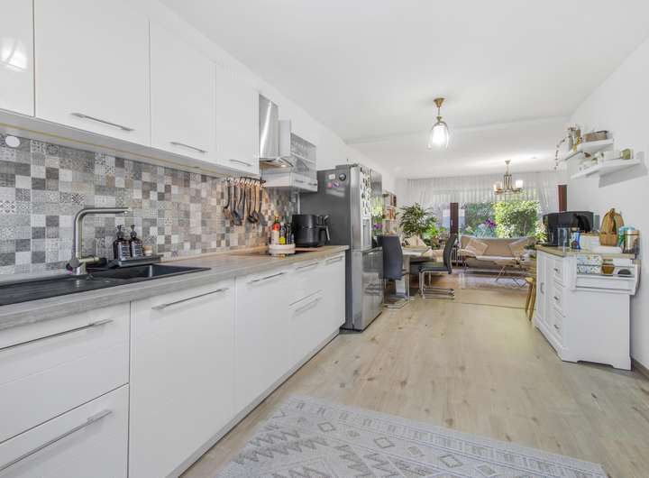 Im Erdgeschoss finden Sie eine offene Küche, die direkt in das großzügige Wohnzimmer übergeht. Von hier aus gelangen Sie auf die Terrasse, die nahtlos in den Garten übergeht – ein idyllischer Rückzugsort, der durch seine grüne Bepflanzung zum Entspannen einlädt. Zudem gibt es im Eingangsbereich einen praktischen Flur, der den Zugang zu einem Gäste-WC ermöglicht.