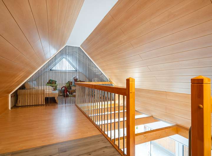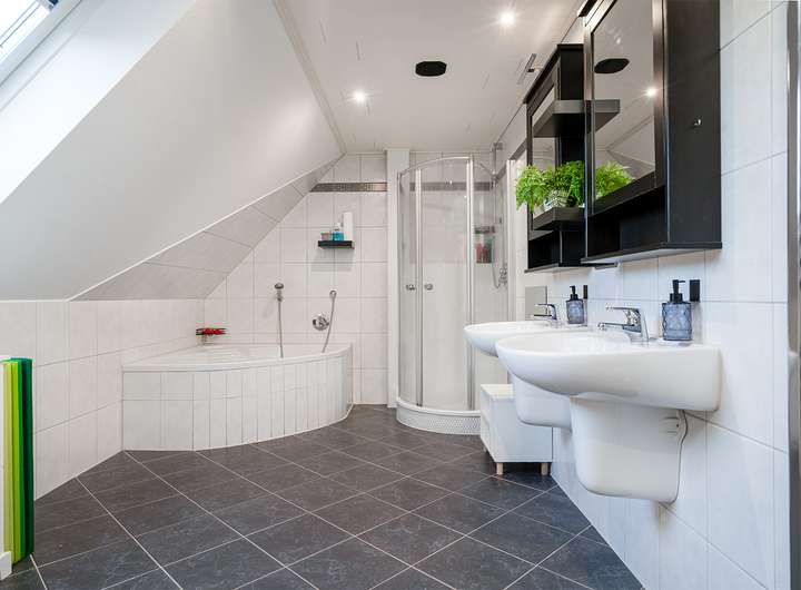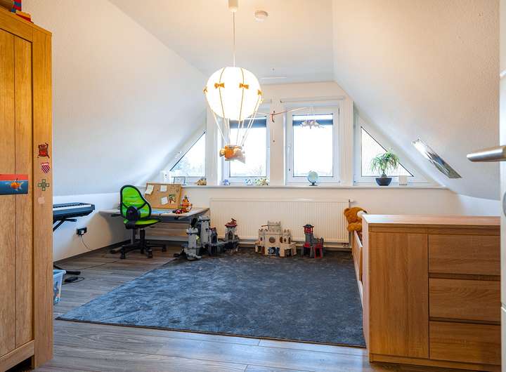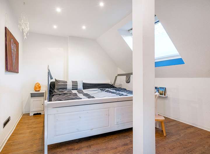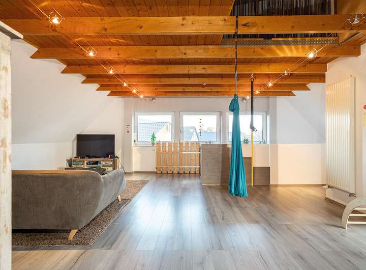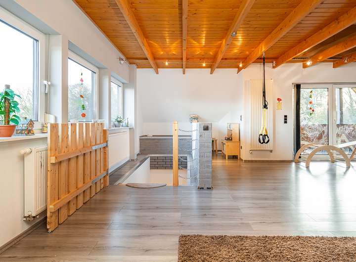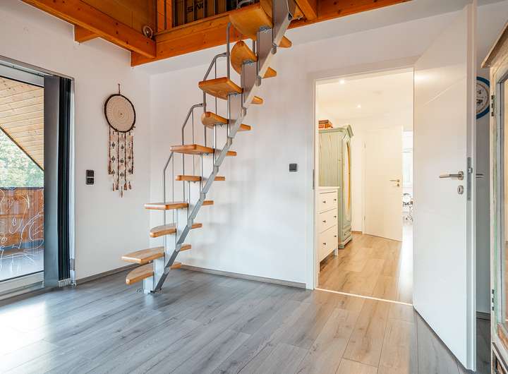 Das Dachgeschoss beeindruckt durch einen großzügigen Wohnbereich mit offener Balkenlage, der eine besondere Atmosphäre schafft und durch eine charmante Loggia erweitert wird. Darüber hinaus befinden sich hier ein Schlafzimmer, ein Abstellraum, ein Kinderzimmer, ein Wäscheraum, ein separates WC und ein großes Vollbad. Der ausgebaute Dachboden eröffnet zusätzliche Wohn- und Kreativfläche: zwei kleine Zimmer sowie eine Galerie bieten Platz für individuelle Gestaltungsideen.