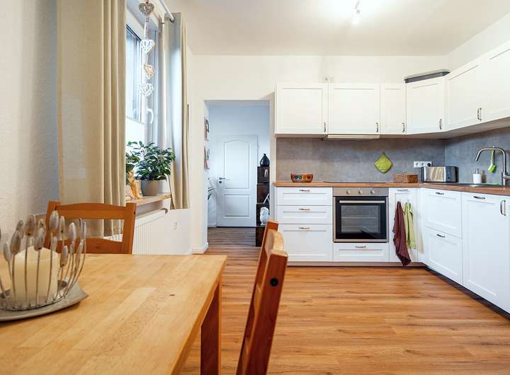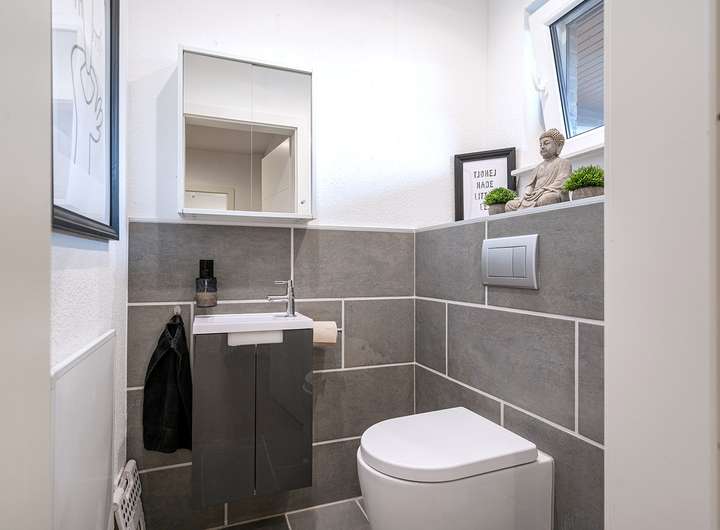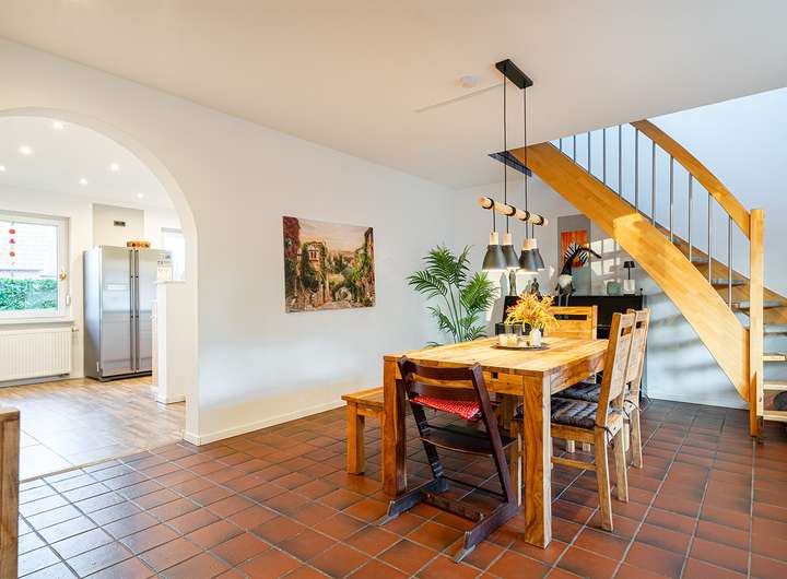 Im Erdgeschoss des Haupthauses erwarten Sie eine einladende Küche mit angrenzendem Essbereich, ein praktischer Vorratsraum sowie ein Gäste-WC.