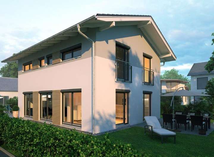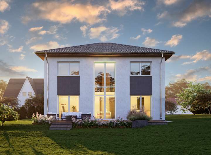 Bei allen vorliegenden Abbildungen und Fotografien handelt es sich um beispielhafte Darstellungen. Möblierungen und sonstige Einrichtungsgegenstände, Lampen, Außenanlagen, wie zum Beispiel Terrassen, Zuwegungen, Stellplätze, Carports, Pool und Gartenanlagen inkl. Bepflanzung sind nicht im Leistungsumfang enthalten. Der Leistungsumfang ergibt sich aus der jeweiligen individuellen Baubeschreibung des Hauses.