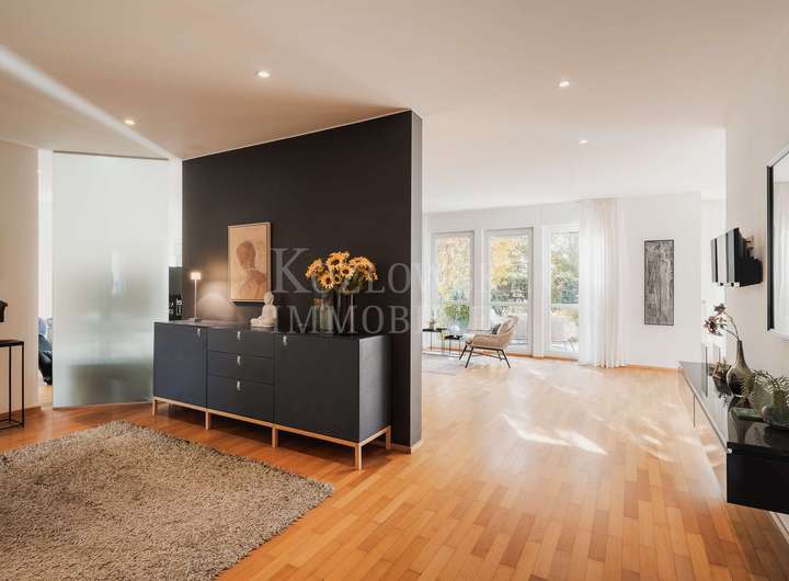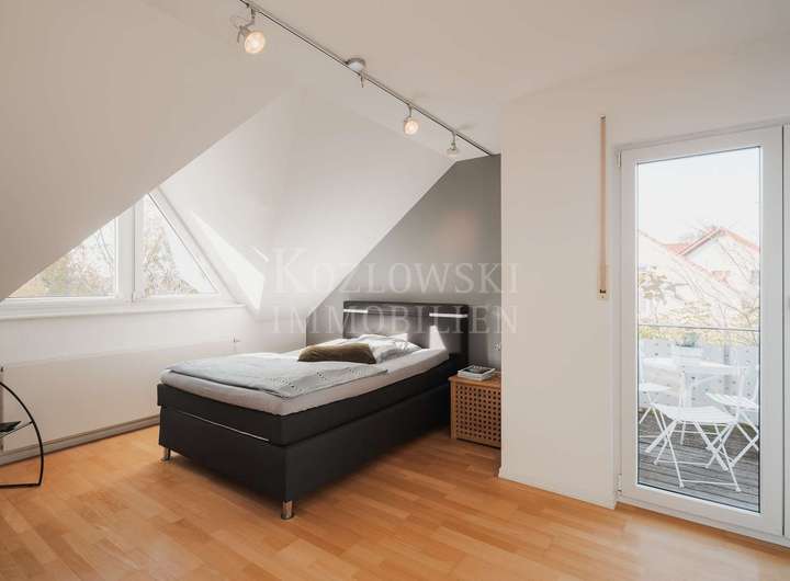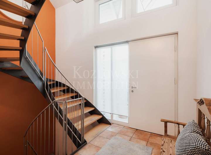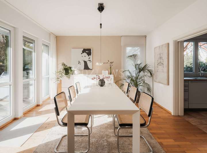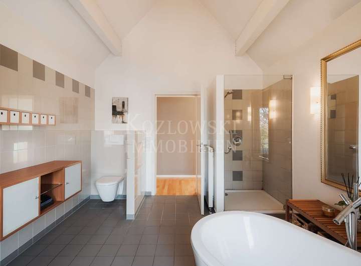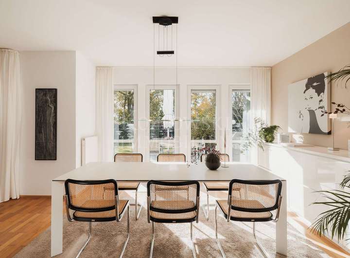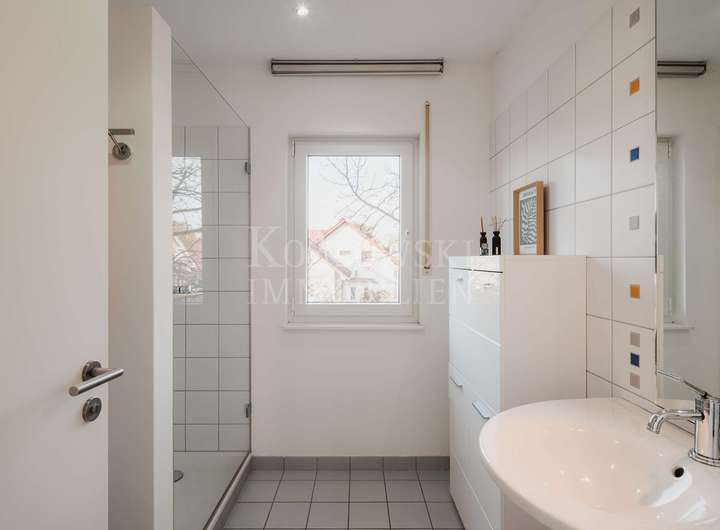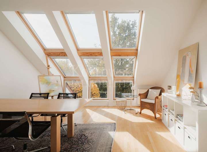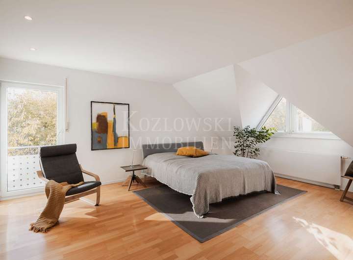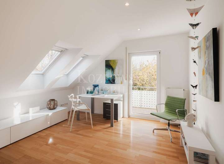 Insgesamt stehen 7,5 Zimmer, ein großzügiges Masterbad sowie zwei weitere moderne Duschbäder zur Verfügung. Mittelpunkt des Erdgeschosses ist der großzügige, bodentief verglaste Wohn- und Essbereich mit rund 65 qm, der einen direkten Zugang zur Sonnenterrasse und zum rund 350 qm großen und herrlichen Sonnengarten bietet. Die funktional-orientierte Einbauküche und praktischer Raumausnutzung grenzt direkt an den Essbereich an. Ergänzt wird diese Ebene durch ein Arbeitszimmer, ein separiert gelegenes Gäste-WC sowie einen geräumigen Hausarbeitsraum. Eine stilvolle Innentreppe führt in das Dachgeschoss, das Sie mit einem zentralen Flur empfängt. Von hier erschließen sich sämtliche Räume dieser Ebene: das nach Süden orientierte, von drei bodentiefen Dachflächenfenstern lichtdurchflutete Atelierzimmer, drei Schlafzimmer - zwei davon mit Balkon - ein großzügiges Masterbad sowie ein weiteres Duschbad.