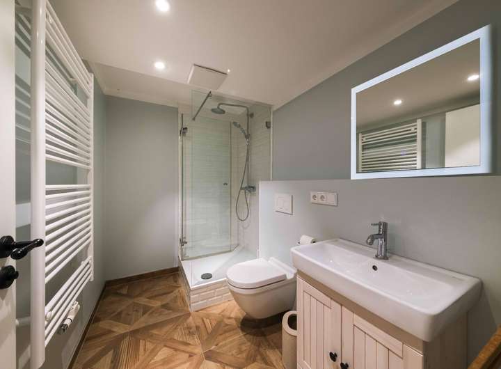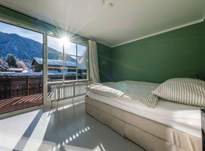 Im Obergeschoss gelangt man über den Flur zu 3 Zimmern mit unterschiedlichen Nutzungsmöglichkeiten - z.B. Schlafen / Ankleide / Büro - sowie einem Badezimmer. Vom Schlafzimmer aus erfährt man bereits beim Aufwachen einen unvergleichbaren Blick auf den Wallberg. Der angrenzende Balkon bietet genügend Fläche zum Sitzen und auch für eine Sonnenliege.